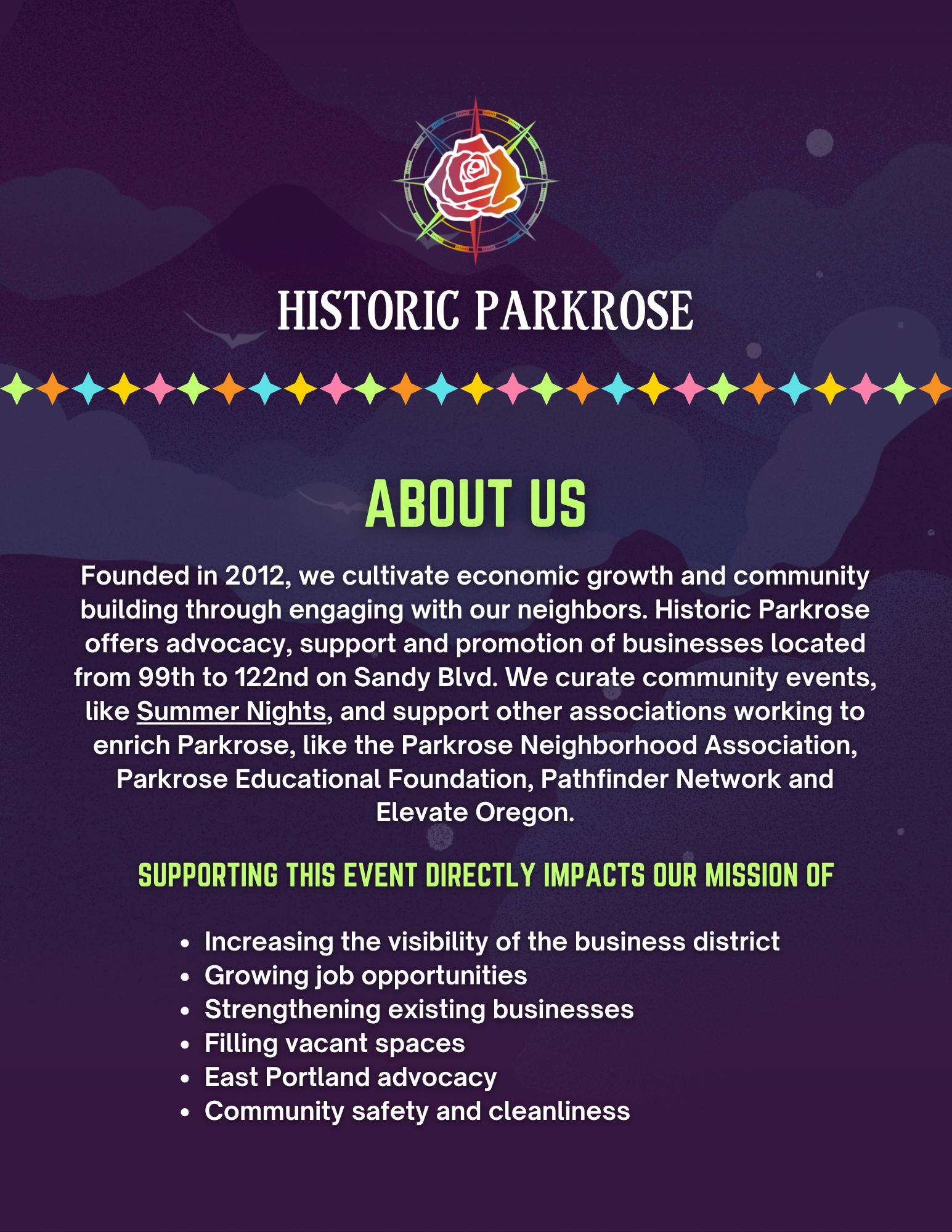 Summer Nights is proudly presented by Historic Parkrose to strengthen community and spotlight the heart of our neighborhood.