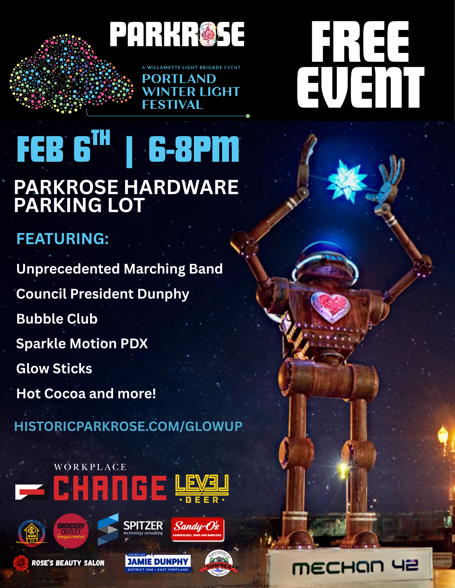 Featuring: Parkrose resident, Council President Dunphy, Unprecedented Marching Band, Bubble Club, Sparkle Motion, glow sticks, hot cocoa and more!
